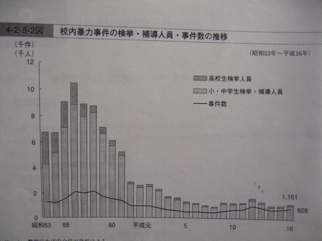 昭和56年ごろが校内暴力のピークですね。昔は大学生が合法的に人を殴ってもいいのか?と思い違いをしてしまうような時期がありましたが、この統計の中には大学生は入っておりません。純粋に高校生以下の統計です。今の30代~40代が酷いことをしていたようです。昔は進学率が低かったので高校の犯罪がこの程度で済んでいますが、今と同様だったとしたら?