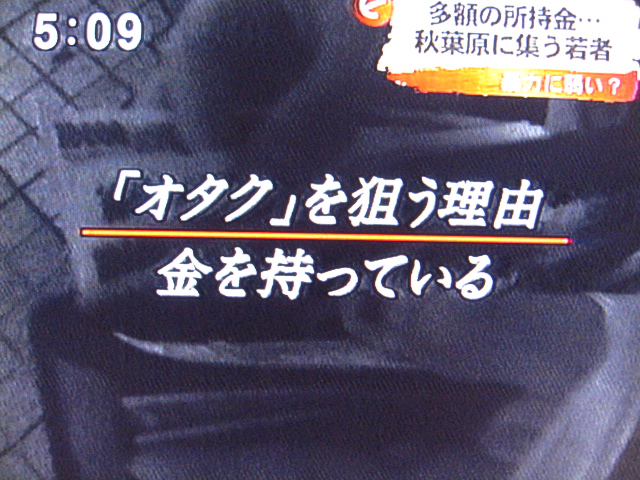 イブニングファイブはオタク狩りを促進させるつもりか?TBSはオタクを叩きながらオタク狩りを叩きつつ促進しようとする・・・という器用な事をやってのけました。これに関しては、画像が多くなりそうなのでシリーズでお届けしたいと思います。