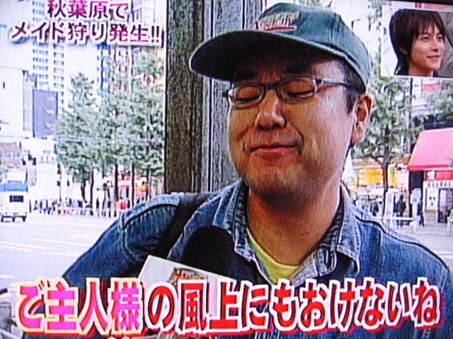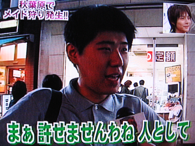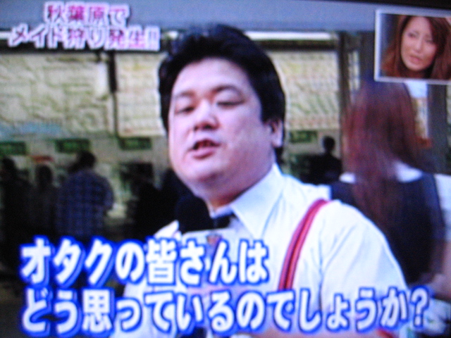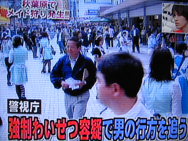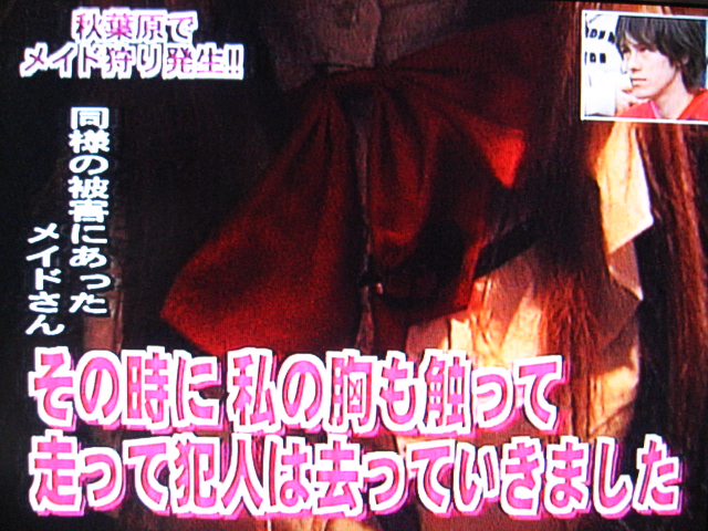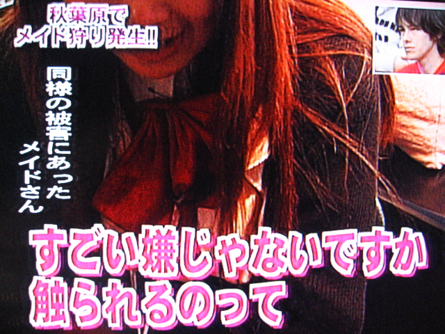 10/29のサンデージャポン内で、スタジオ大爆笑のメイド狩りの話が出ました。出演者は皆大爆笑です。傷害、強制猥褻という事件なのに軽いノリですねぇ。また、オタが出るたびに大爆笑。人権的にどうなんでしょ。バカ専用番組だからおkなんですか。そうですか。