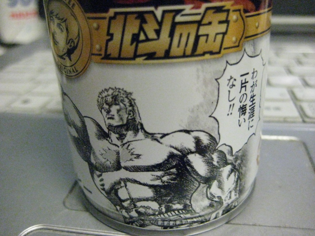 期間限定で販売されているポッカコーヒーのタイアップ商品「北斗の缶」。私は病床に突っ伏して居ても見舞い客が缶コーヒーを手土産に一抱え持ってくるほどのコーヒー狂でして、コーヒーと書いてあればとりあえず飲まずには居られないカフェイン中毒者です。風邪をひいたりしているときはカフェインは飲まない方が無難だそうです。ビタミンCを破壊して、治りを遅くするのだとか。循環器系に「力(リキ)」が入るからとそれでも飲みますけどね。