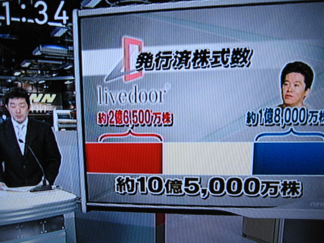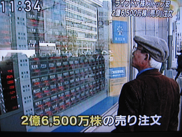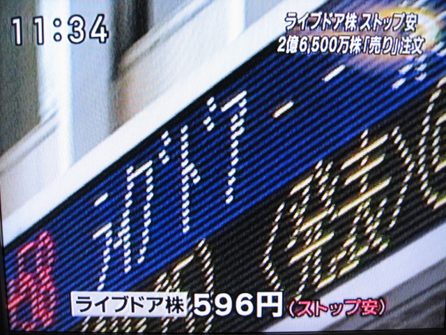 ライブドア株が一連のスキャンダルの影響で午前の取引を終えて値がつかない状態。ストップ安とのこと。先の捜査が堀江社長本人にまで及べば、会社が解散する可能性も捨てきれないという報道、発言もあり、予断を許さない状況だそう。
