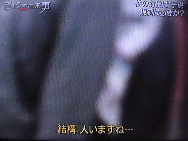 結構人居ますね・・・という発言ですが、一般人も多く混ざっていると思いますよ?周囲にモザイクがかかってましたが、ここは紙風船かソフ14でしょうね。裏通り(カオス街)が映ってましたから。というよりも、居ますねって・・・。居ちゃ悪いんでしょうか?また、少女を陵辱するゲームが圧倒的だなんてよくもそんな大法螺(オオボラ)を吹けますね。わたしの知る限り、そんなソフトばかり扱うショップは無い気がするんですが。