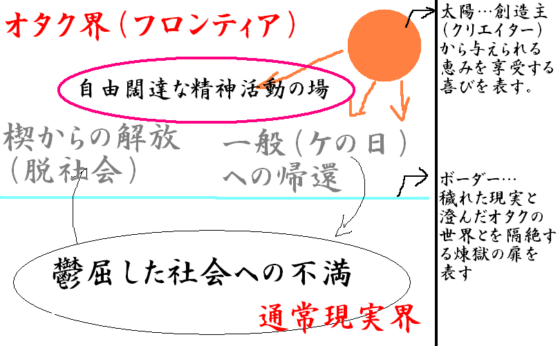 文章中に書いた、どこかから電波を受けとってるんじゃないかーとか、難解にする解説とか、勝手な世界観を創造するタイプの人間。私が批判したかった学者や識者が好んで使うタイプの絵図です。この絵図を見て、素晴らしい!と思う人は、ちょっと冷静になってください。書いた本人さえ何を書いているか分かってないような絵図なんですよ。これは。